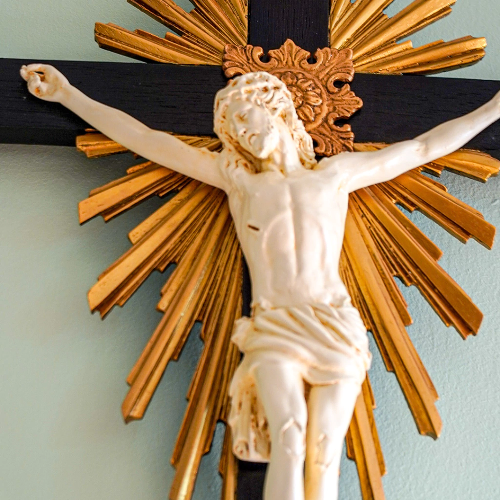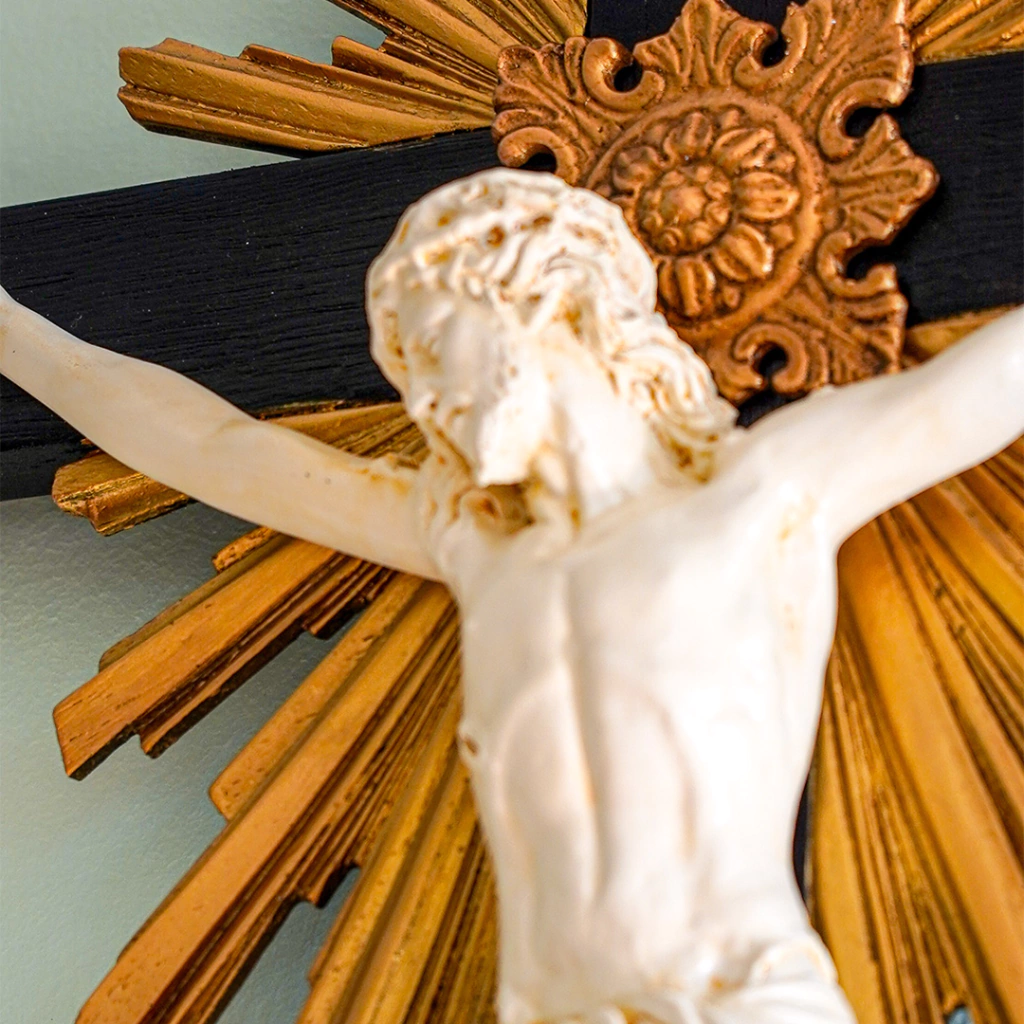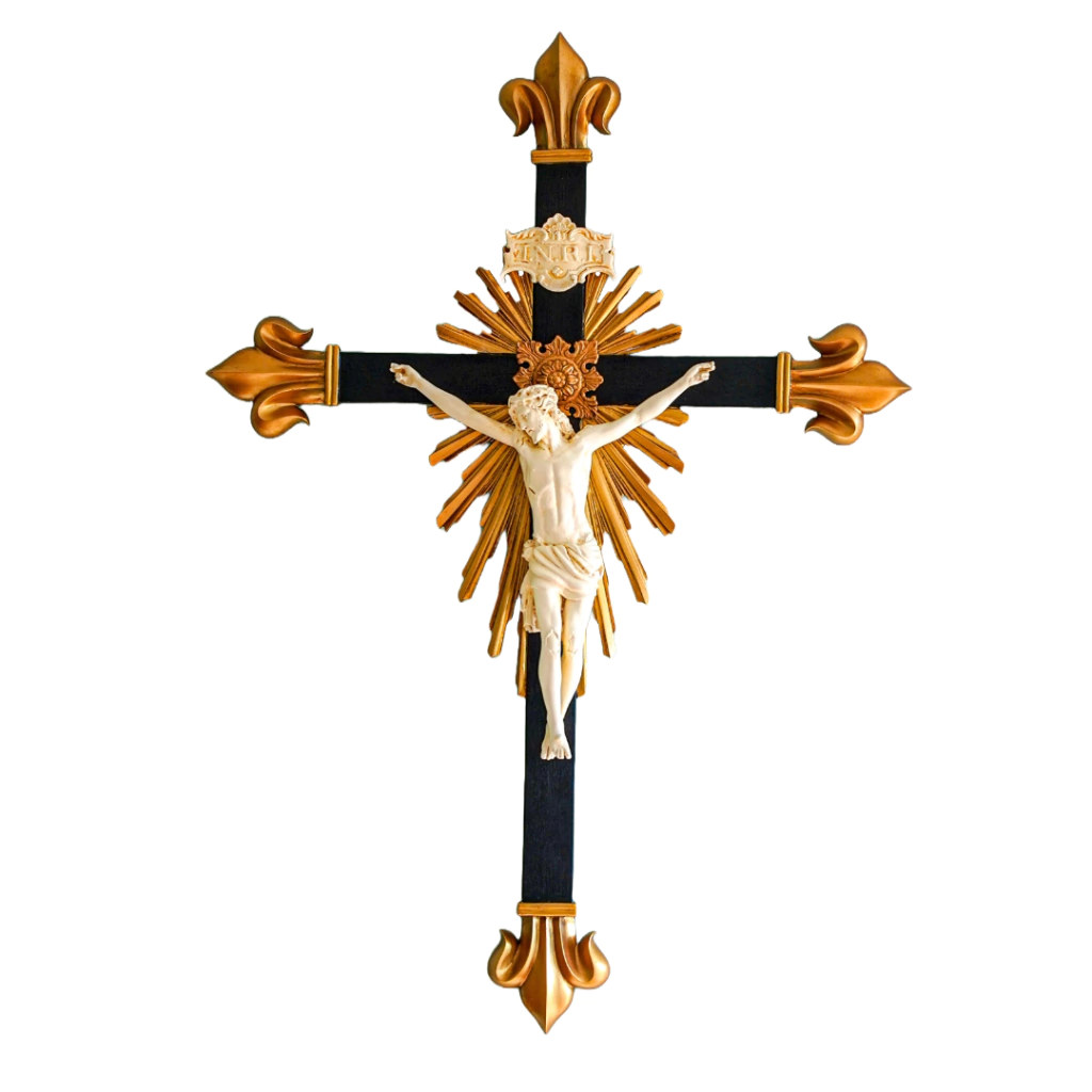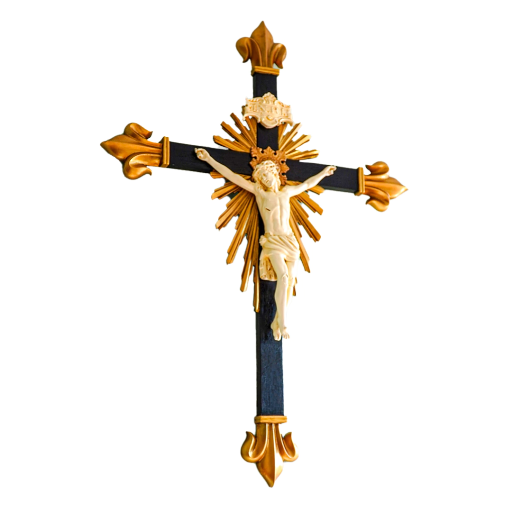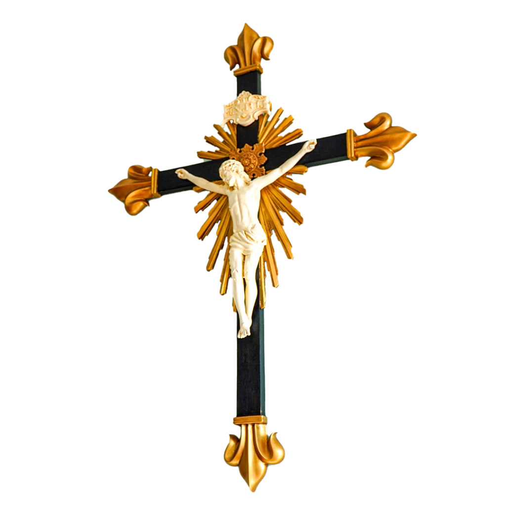 A cruz de madeira de 60 cm com ponteira de flor de lis, na cor marfim, é uma obra que une simplicidade e nobreza. O detalhe da flor de lis, símbolo de pureza e realeza, confere à peça um toque de elevação espiritual. O acabamento em marfim traz uma sobriedade que, junto ao simbolismo da cruz, convida à oração e reflexão sobre o sacrifício de Cristo.