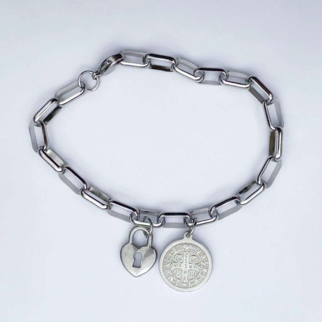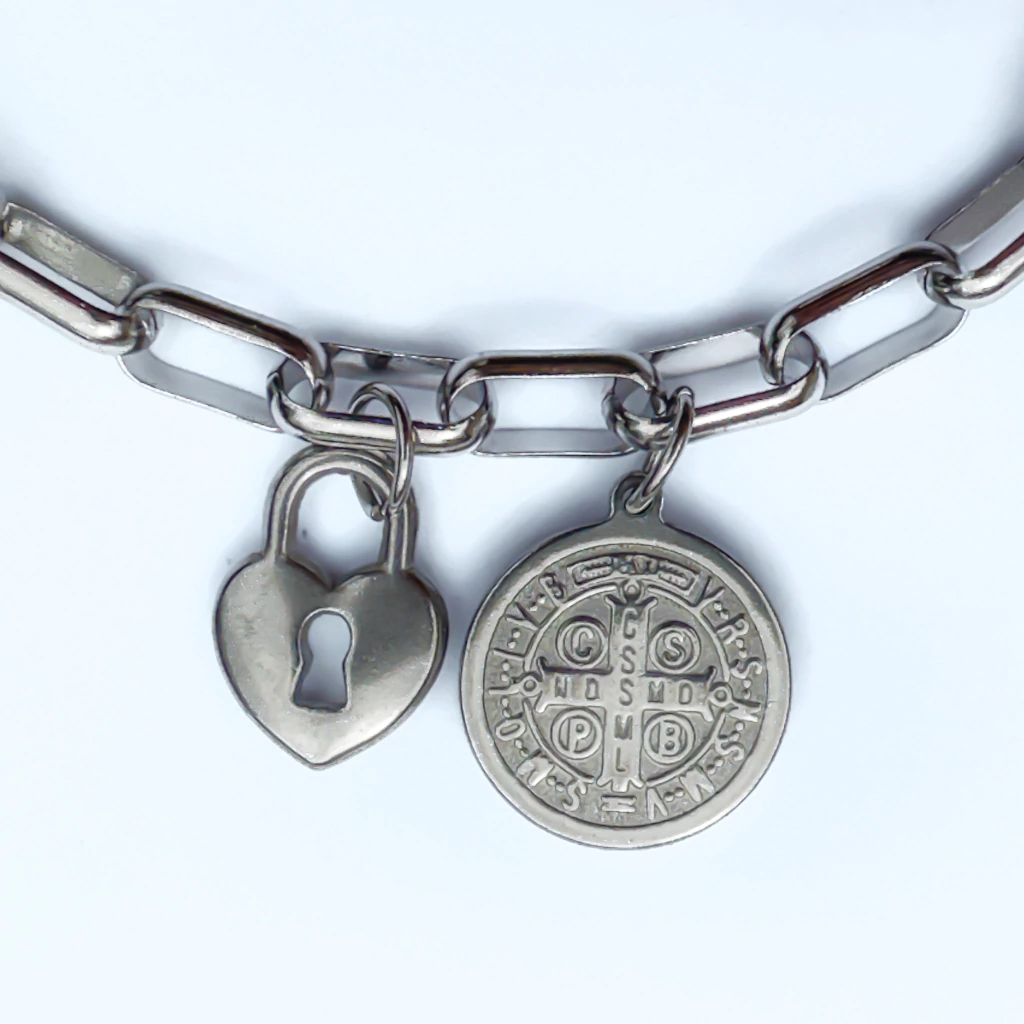 Por último, mas não menos importante. Como São Luís G. de M. fala sobre um sinal externo de sua consagração a Santa Mãe de Deus, enviaremos também uma linda Pulseira prateada de Aço Inoxidável com uma preciosa Medalha de São Bento e cadeado para que você tenha um excelente material que não irá ficar "preto" (ou seja, não oxidará) e poderá ter como um instrumento de apostolado para todos os que ficarem curiosos ao ver que você carrega uma corrente como um verdadeiro escravo em pleno Século XXI, o que abre diversas oportunidades para explicar um pouco sobre a Consagração a Nossa Senhora a diversas pessoas que ficam curiosas com esse simbolo exterior e por uma simples curiosidade em breve conhecerão a devoção super excelente a Mãe de Deus, através de um escravo fiel (você)!