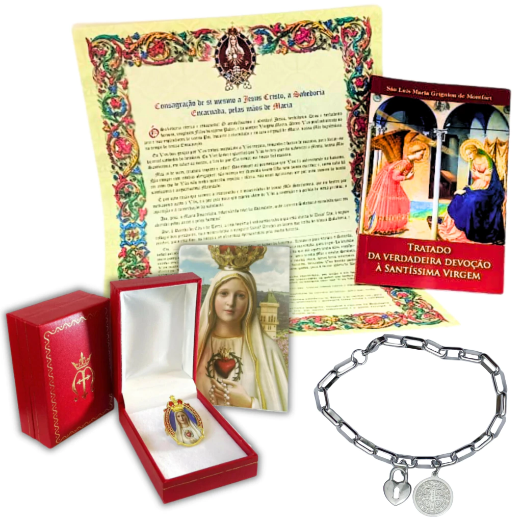 No kit você também receberá o livro Tratado da Verdadeira Devoção a Nossa Senhora que explica pormenorizadamente o que você está prestes a receber com a Consagração a Nossa Senhora. Como diversos santos na Igreja já afirmaram ser a melhor e mais perfeita devoção a Jesus e a Maria. Tudo que você precisa, até mesmo as orações preparatórias para a consagração, estão neste livro.