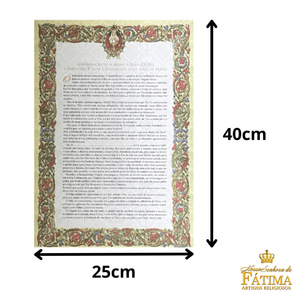 Nele você terá o Pergaminho da Consagração para preencher no dia de sua consagração, esse foi feito em uma desing que condiz inteiramente com essa solenidade inesquecível em sua vida. Muita famílias tem até mesmo emoldurado esse pergaminho após a sua consagração e pindurado na parede de sua casa como sinal de um passo que fará toda diferença em sua salvação.