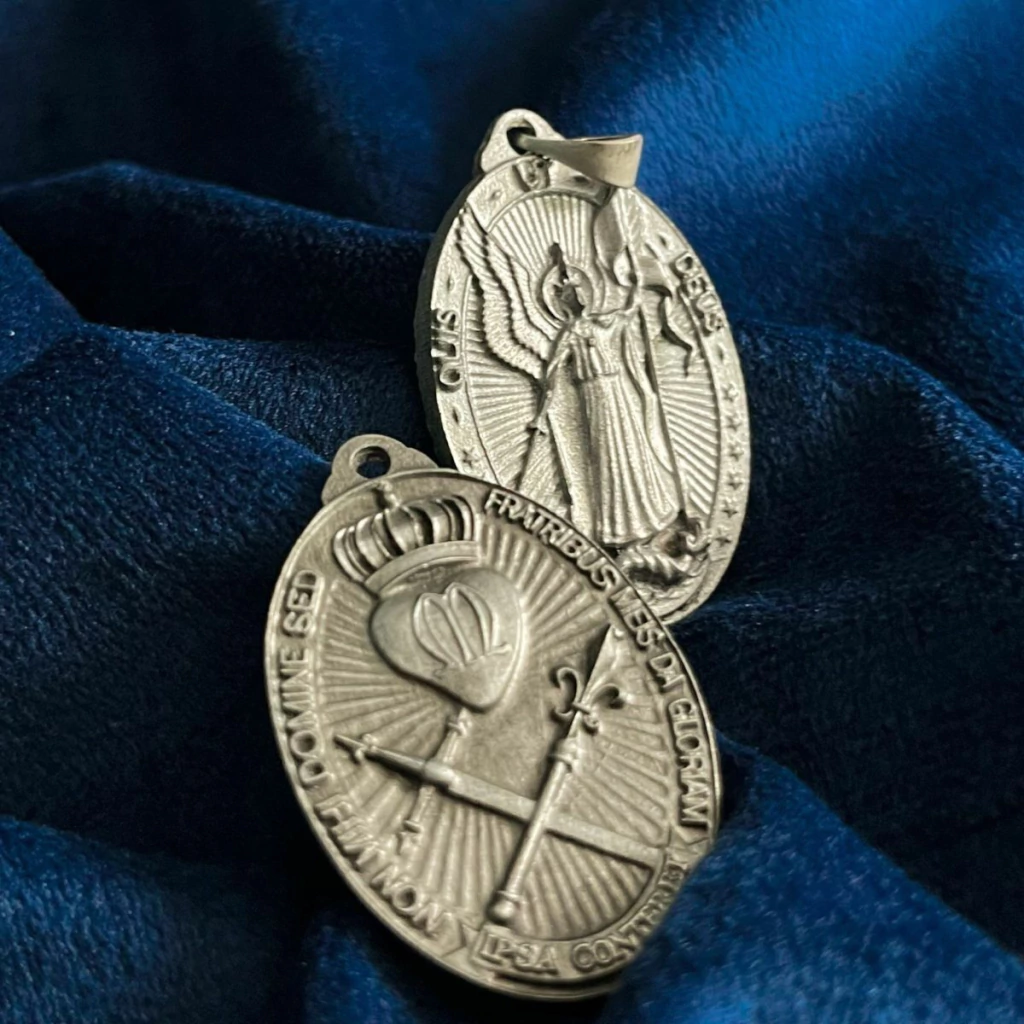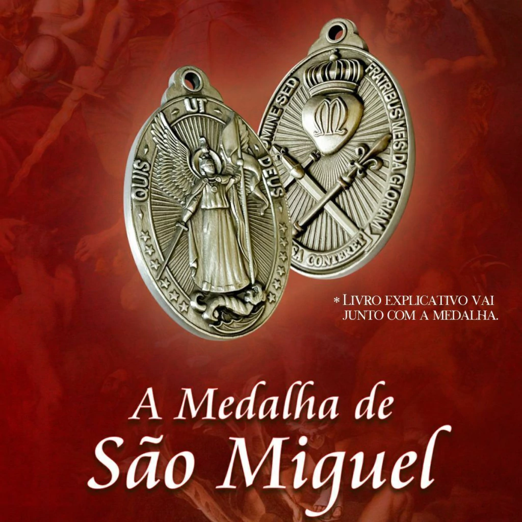 Medalha: Fabricada em metal Zamac com acabamento rústico, possui medidas de 44mm x 27mm, representando o esplendor de São Miguel Arcanjo, um dos maiores defensores da glória de Deus e exemplo de fé e coragem.