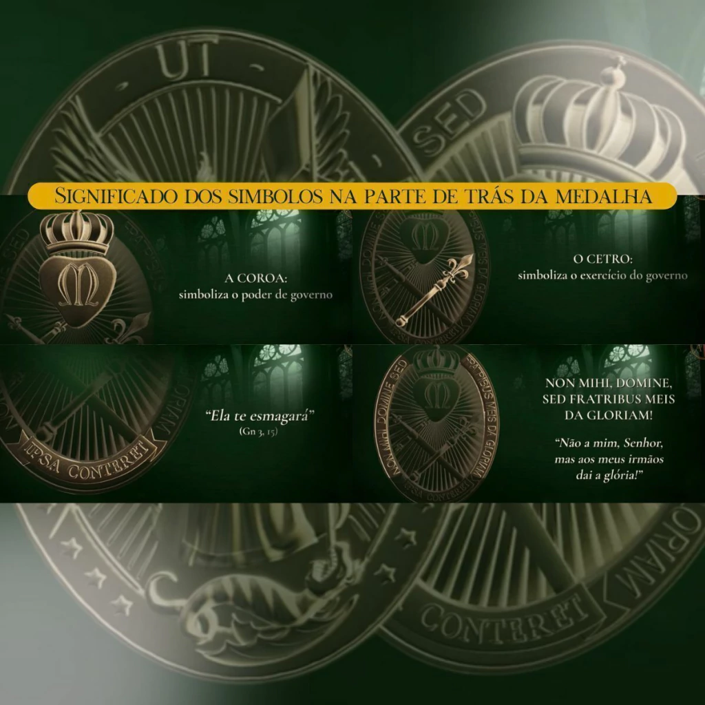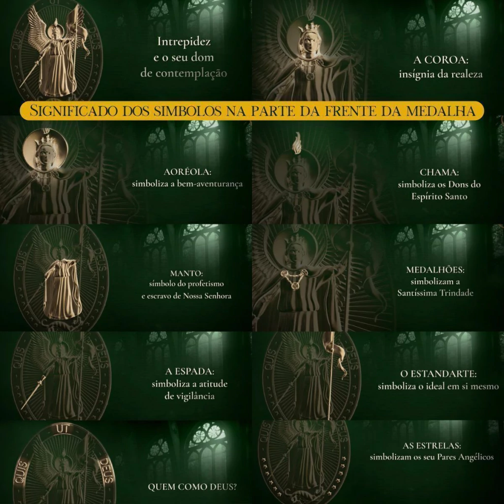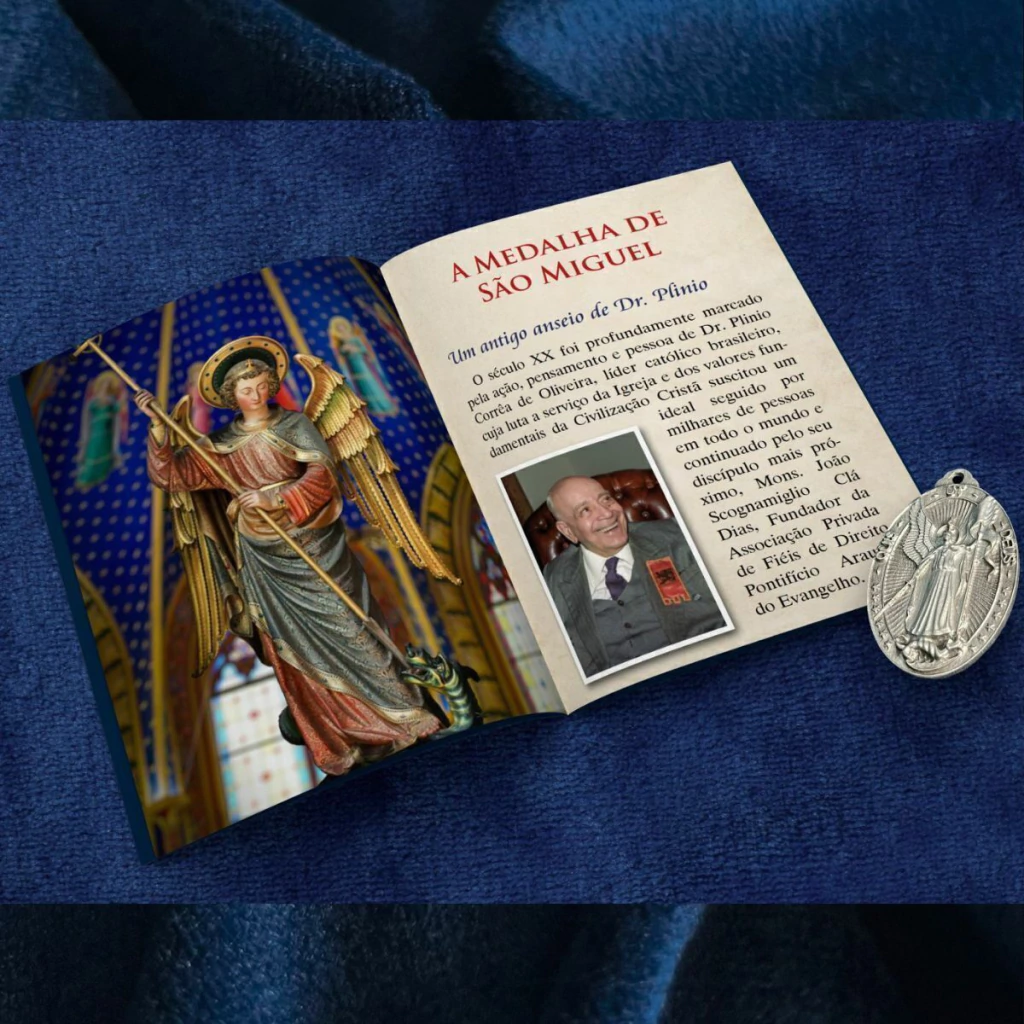 Livreto: Acompanha um livreto de 48 páginas em papel couchê 90g (medindo 90x137mm), que explica pormenorizadamente cada simbolismo da medalha e contêm também reflexões e orações dedicadas a São Miguel, o Arcanjo da Justiça Divina.