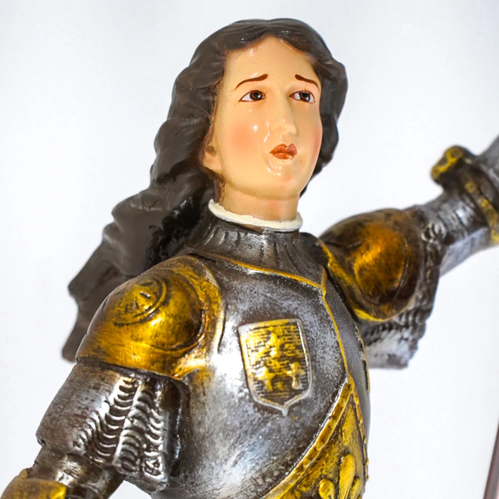 A "Santa Joana D'Arc Com Estandarte Policromado 52 Cm" é uma peça de grande significado para os devotos que buscam uma representação da santa guerreira com uma expressão de coragem e devoção. Esta estátua não só embeleza o ambiente, mas também inspira e eleva a fé dos devotos, servindo como um símbolo poderoso de força e espiritualidade.