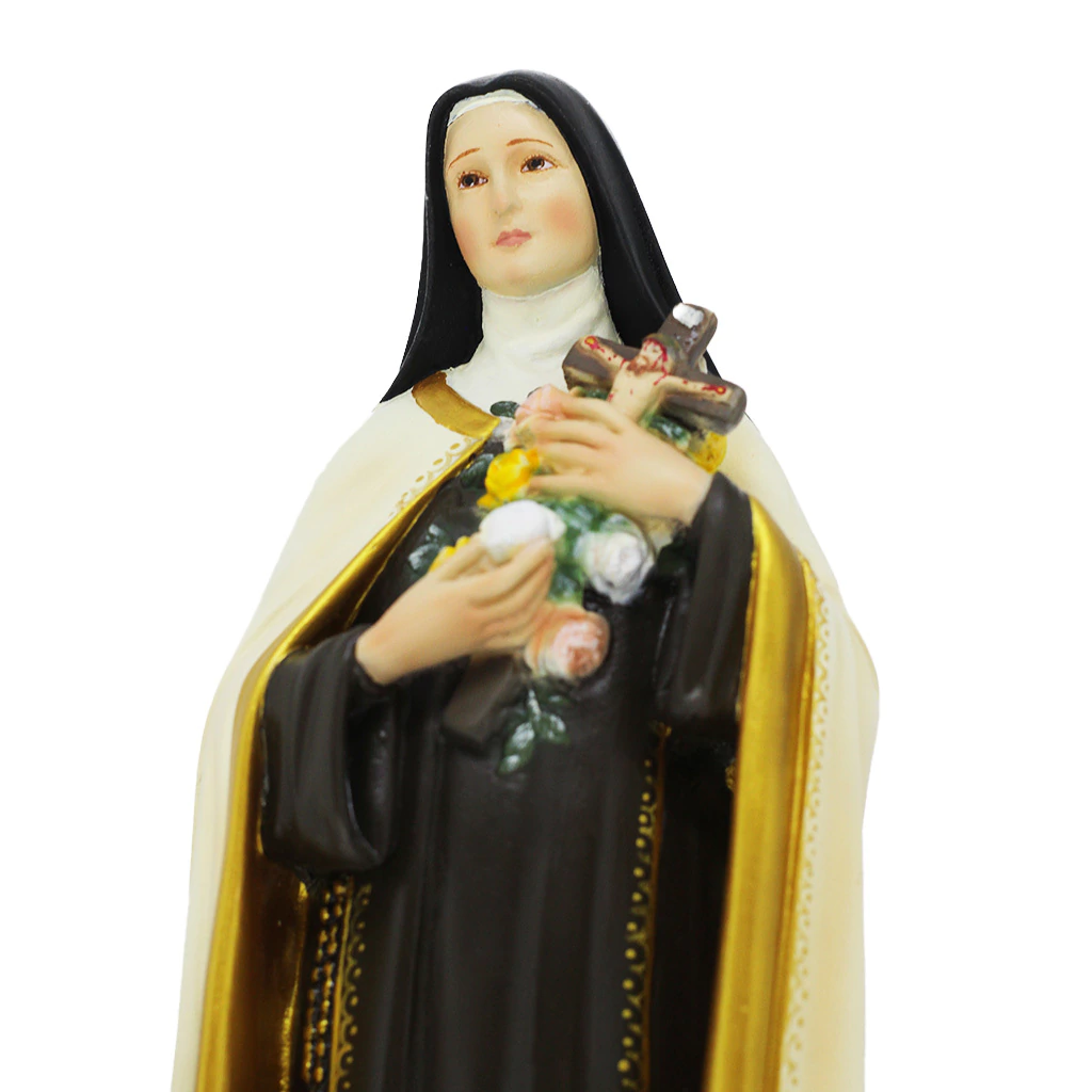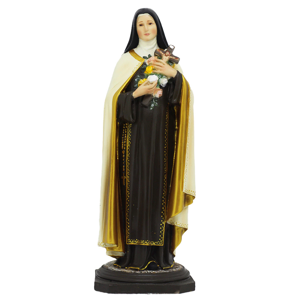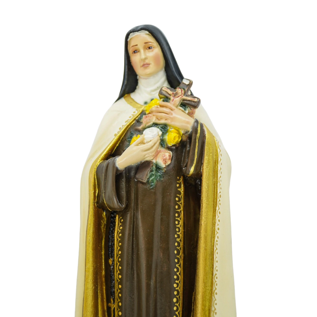 A imagem de Santa Teresinha do Menino Jesus, em pé, com 30 cm de altura e acabamento policromado, é uma peça de arte que celebra a "Pequena Flor" do Carmelo, símbolo de simplicidade, amor e devoção. Santa Teresinha, conhecida por seu caminho de humildade e entrega total a Deus, é uma das santas mais amadas da Igreja Católica. Com a presença de uma cruz e um buquê de rosas em suas mãos, símbolos de sua vida de sacrifício e amor, esta estátua é ideal para aqueles que desejam expressar sua devoção e buscar inspiração em sua "pequena via" de santidade.